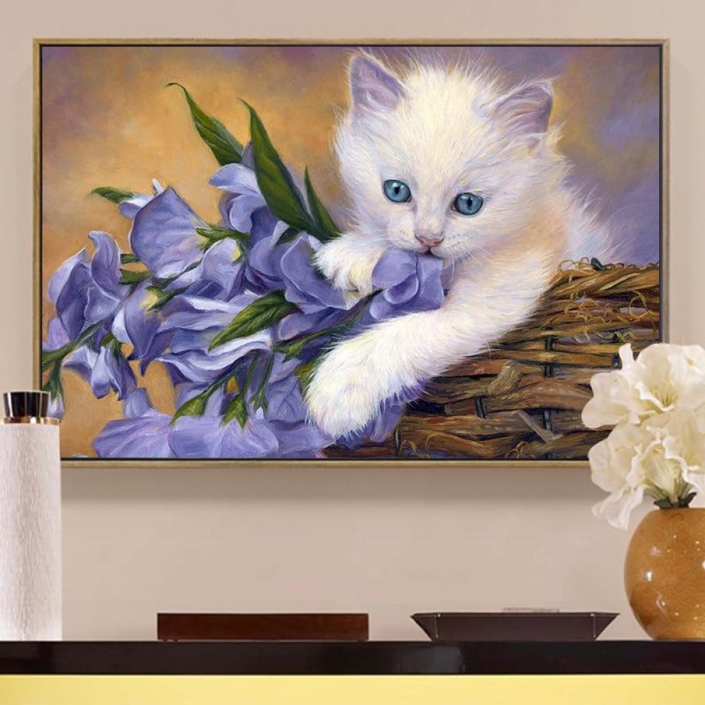 White Cat & Purple Flowers 5D DIY Paint By Diamond Kit
